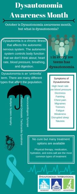 It is almost October, and with that comes Halloween, National Teacher’s day, and Dysautonomia Awareness. But with that comes many questions. Mainly, what is dysautonomia? It sounds like a terrible dystopian world. Sometimes, it’s just as much a nightmare.