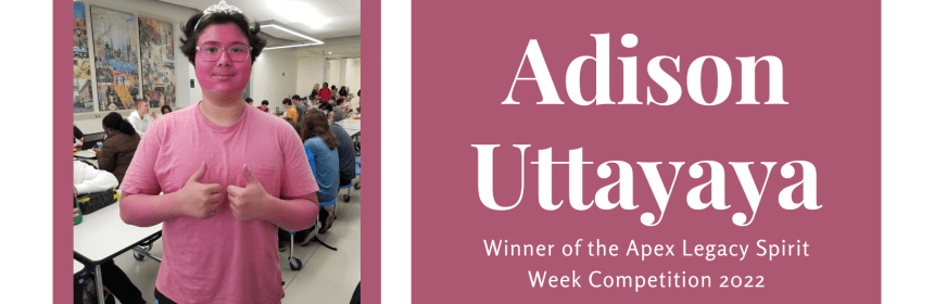 Adison Uttayaya is this year’s winner of the Apex High Spirit Week competition. There was a lot of amazing school spirit during Homecoming week, but Adison’s commitment to the pink-out theme on Wednesday was a notable outlier. After he won Wednesday’s competition, he moved on to the final round of voting, which included the winners from each day, and won the competition overall. Congratulations Adison on winning the Bojangle’s $10 gift card!